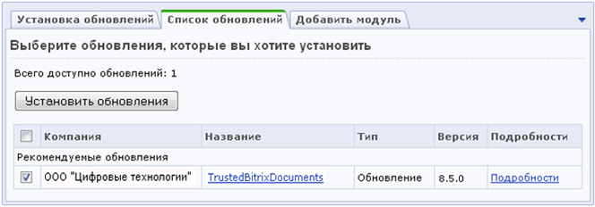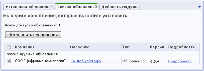 На закладке Установка обновлений представлена информация об имеющихся обновлениях модулей.
