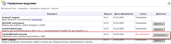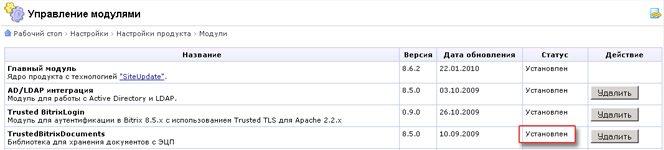 Необходимо скопировать каталог c исходными текстами модуля trusted в каталог bitrix/modules/ . При отображении общего списка модулей он будет присутствовать в нем под названием «TrustedBitrixDocuments» версии 8.5.0 (Рис. 4).