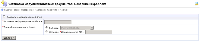 Рис. 5 Первый шаг установки модуля – создание инфоблока