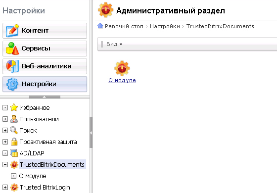 Установка модуля TrustedBitrixDocuments дает возможность создания библиотек документов, управления содержимым и настройки доступа к ним. В библиотеках размещаются документы, составляющие информационную и коммерческую тайну организации, документы, предназначенные только для внутреннего пользования или имеющие стратегическое значение.