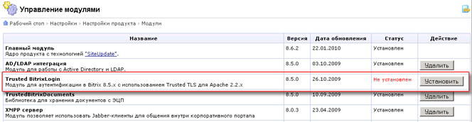 - Необходимо скопировать каталог c исходными текстами модуля TrustedBitrixLogin в каталог bitrix/modules/ . При отображении общего списка модулей он будет присутствовать в нем под названием «TrustedBitrixLogin» версии 8.5.0 (Рис. 4).