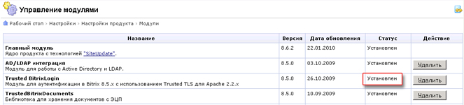 Весь необходимый функционал TLS-аутентификации и ЭЦП реализован с помощью двух специально разработанных модулей: TrustedBitrixLogin и TrustedBitrixDocuments (модули разрабатывались для продуктов «1С-Битрикс», начиная с версии 8.5.).