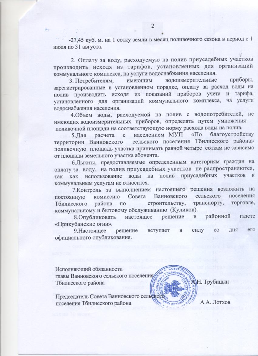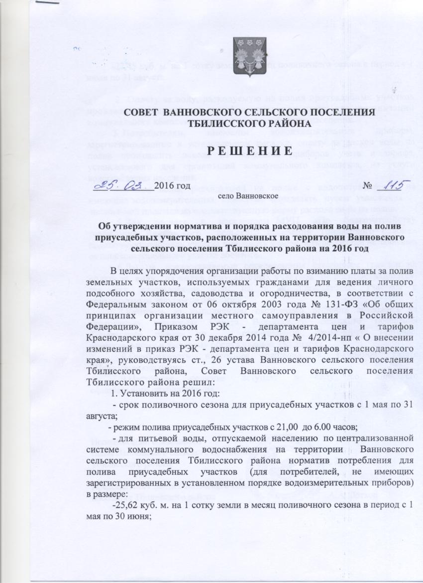 Решение об утверждении норматива и порядка расходования воды на полив приусадебных участков, расположенных на территории Ванновского сельского поселения Тбилисского района на 2016 год.